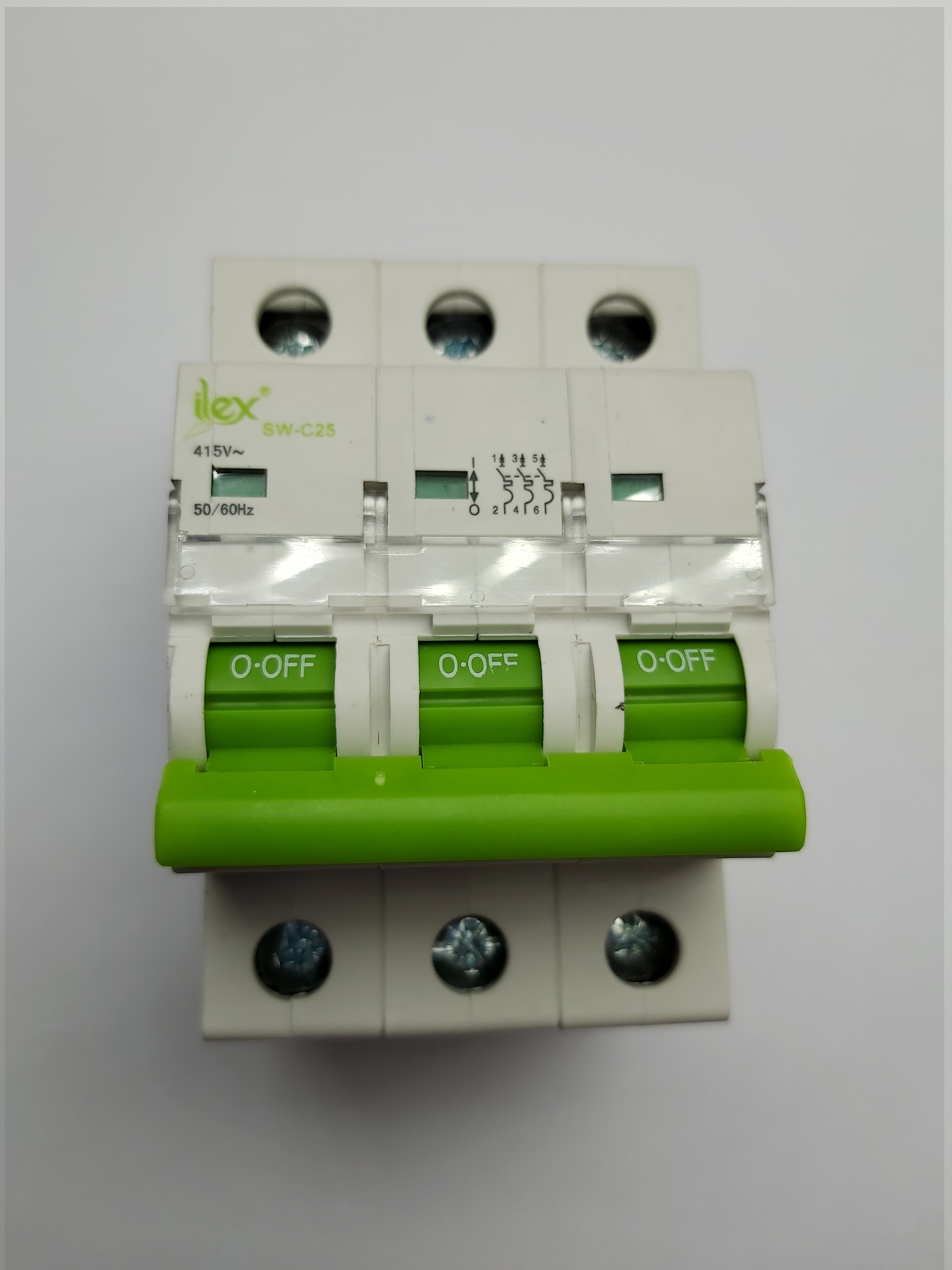 Třífázovy 25A jistič s vypínací charakteristikou C pro obvody s vyššími proudovými rázy (žárovkové skupiny a motory s lehkým rozběhem).